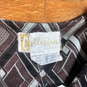 Retro brown, white, and black diamond patterned top by Collegian of California. Originating from the 1970s, this unique piece could be worn as either a shirt or a cardigan. The material feels like pure polyester or a poly blend. Fits like a size small.