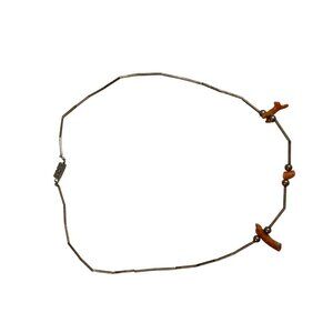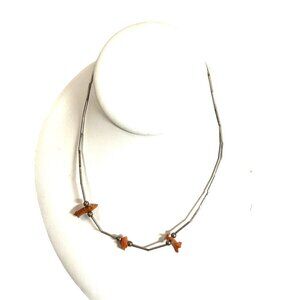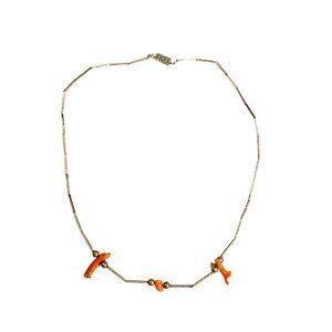 This delicate vintage necklace features genuine coral beads paired with silver-tone tube accents. A timeless piece evoking Southwest and Native American design motifs.