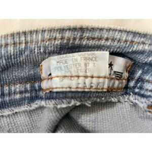 Made in France, these retro jeans feature patch pockets at the front and corduroy fabric. The legs have distressed horizontal details and are wider at the bottom. With a metal zipper and metal front button. No back pockets.