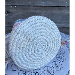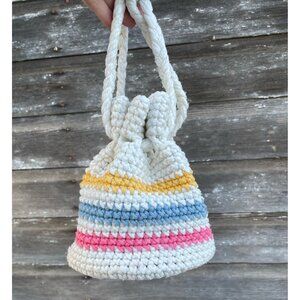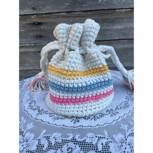 Vintage 1970s Cotton Crochet Pastel Stripe Drawstring Bag Purse