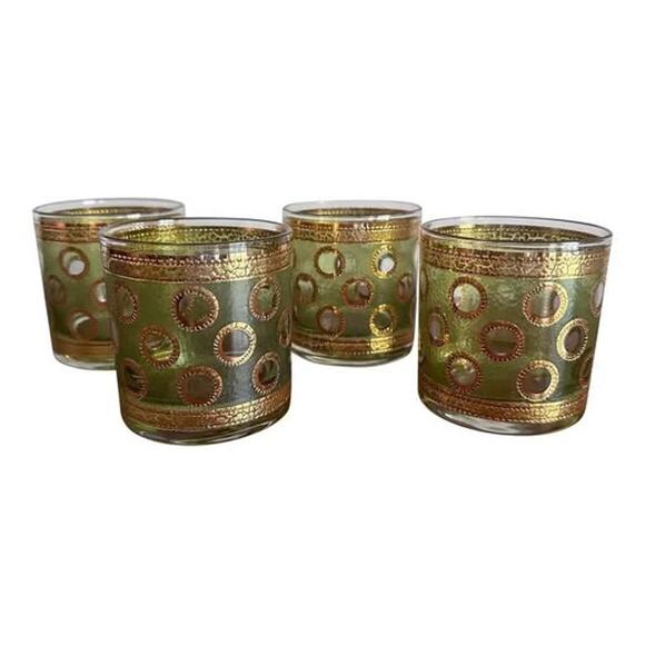 Culver Ltd. glassware, mid century modern old fashioned glasses. This 4 piece set is clear glass in the cocktail old fashioned form with 22 karat gold decoration. The design is crackled gold with three staggered rows of circular cut-outs to the exterior of the glass that lends a green patina to the interior.