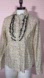 Adorable tiny floral print on a fun feminine designed western shirt. Designed with a double ruffle tuxedo front, shimmering pearl like metal snap front, long sleeves with large three snap cuffs. Charming blouse in a cream with camel colored flowers and black lace on the tips of the ruffles. No fiber tags but feels like cotton polyester blend with easy care.