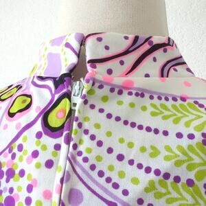 Vintage 1970s Anika New York, Stockholm women's dress union made AFL ladies garment workers Union zip back metal zipper belted colorful funky psychedelic print purple pink white long sleeve clasps at sleeve wrist and neckline