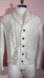 Classic cable knit sweater with a high shawl collar and faux leather buttons. Designed to fit the Marlboro man with strong shoulders and a narrow waist. Thick sweater with light pilling throughout on a cream colored acrylic yarn.