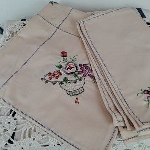 Vintage 1970s Embroidered Floral Tablecloth with 6 Embroidered Napkins Square