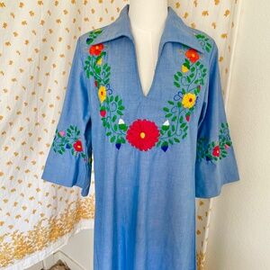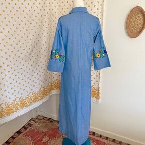 Beautiful vintage 1970s embroidered maxi dress from Pierre Marques, Acapulco, Mexico. Lightweight chambray blue fabric with vibrant multicolor floral embroidery on the chest, sleeves, and hem. Features a collared V-neckline, long sleeves, maxi length, and side slits for movement.