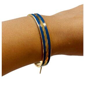 A blue and gold etched bangle bracelet. Has a hinged open design and a safety chain. Bangle is small size.