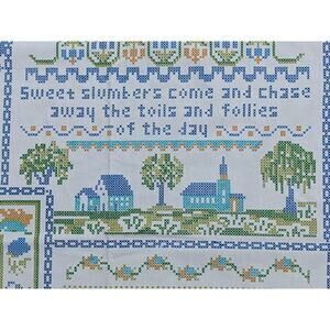 Vintage sheeting fabric with sweet sayings like "Home Sweet Home" & "To Love and Be Loved Is the Greatest Joy on Earth" etc. Probably 50/50 cotton/poly percale. Never used - this is not salvaged & is in excellent unused condition. There's no maker's mark, but I found identical fabric online that was labeled "Stitch Big by Lori Holt for Riley Blake Designs" - perhaps a reprint? I know this pattern was sold by Sears in the 1970's. Please note this fabric was photographed outside & looks a bit washed out - the colors are actually brighter like the close-up pic of the faux cross-stitch.