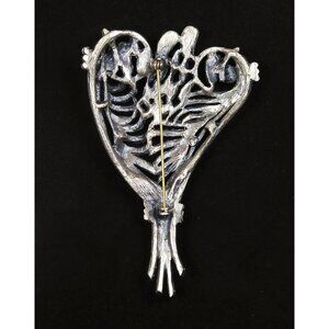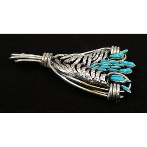 A bold and playful piece of 1970s fashion jewelry, this silver-tone brooch features a stylized bouquet of faux turquoise “flowers” arranged in a sculptural spray. Measuring approximately 3.5" high, it’s unmarked but full of character—perfect for adding a pop of retro charm to any look. Good vintage condition with light wear consistent with age.
