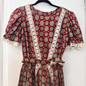 Embrace vintage Southwestern charm with this stunning 1970s Faye Creations Patio Dress from Tucson, Arizona. Featuring an eye-catching boho floral print in rich red, blue, and yellow tones, this dress is adorned with delicate lace accents, adding a feminine, cottagecore touch. Perfect for summer festivals, garden parties, or a chic patio soirée, this flowy midi dress will make you stand out in any crowd. The puff sleeves and empire waist enhance the vintage silhouette, while the lightweight fabric keeps it breezy and comfortable. In excellent condition for a true vintage lover. Fits like a size Small. Don’t miss out on this timeless gem!