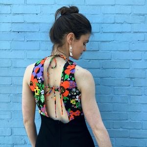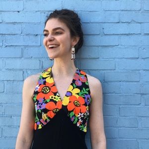 Let your hippie self shine in this beautiful floral dress! Originally from the 1970s, this vintage halter maxi dress is black with a floral pattern chest. It has 3 ties in the back to add to it's hippie charm. It's in excellent vintage condition, with no snags, stains or loose hems.