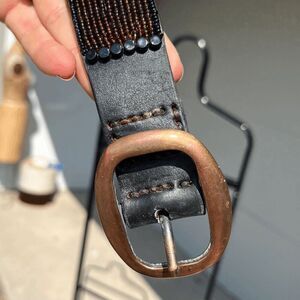 Vintage 1970s Full-grain Leather Bead Embellished Belt Unisex Solid Brass Buckle