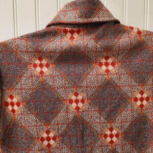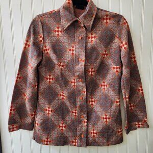 Carrie shirt/ Vintage 1970's funky diamond print shirt by Stage 7. It's like diamond Inception! Diamonds inside of diamonds on this fun & funky print medium weight polyknit button front shirt! Dagger collar, buttons up the front with round red buttons with matching buttons at the cuffs. Unlined, no shoulder pads. Gotta love a good 70's print!