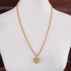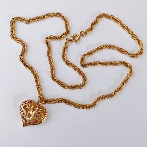 A bold 1970s-era piece with a romantic edge, this gold-tone necklace features a detailed openwork heart pendant on a textured rope chain—perfect for layering or wearing as a solo statement.