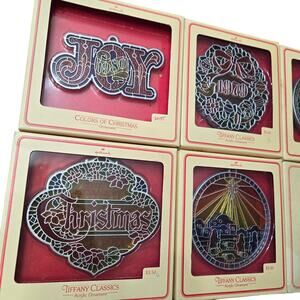 Add a touch of vintage charm to your Christmas tree with this beautiful lot of 7 Hallmark Tiffany Classics acrylic ornaments from the 1970s! These ornaments have a unique stained glass look that will catch the light and add a festive glow to your holiday decor.