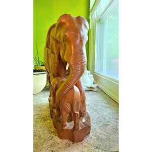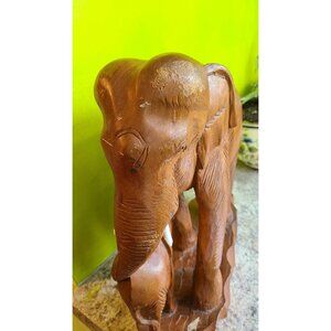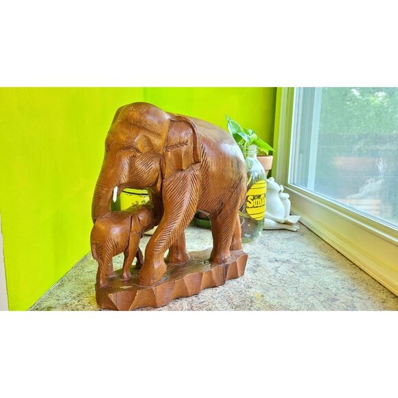 Vintage 1970s Hand Carved from one solid peice of wood. Exotic, Primitive and fascinating, carving of mother elephant and her calf from Thailand. This rustic art peice has a delightful bohemian appeal.
