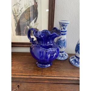 Vintage 1970s Hand Painted Victorian Style Cobalt Blue Ironstone Pitcher