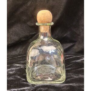 This is a vintage 1970's Patron tequila bottle, handcrafted in Jalisco, Mexico, at the Hacienda Patron distillery. Each bottle is hand-blown, as evidenced by the bubbles in the glass, ensuring a unique and premium feel. These distinctive bottles are sought after by collectors and hobbyists to add a unique addition to their collection. Approximate capacity: 2 cups. Please see the provided photos for further details. (artificial greenery not included)