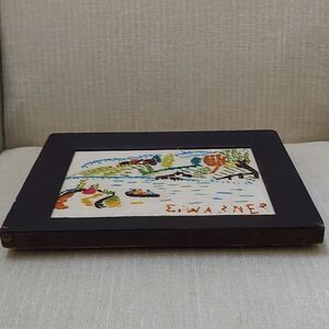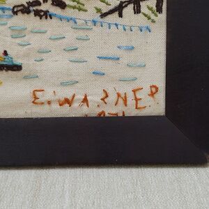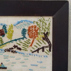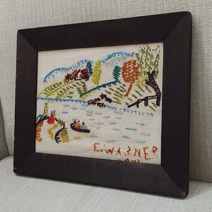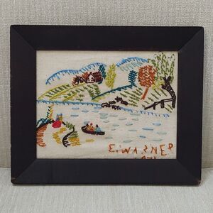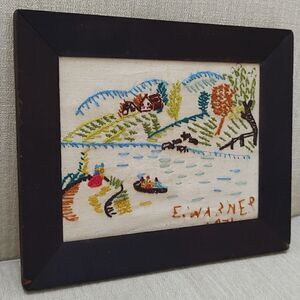Vintage Handmade 1970's Crewel Fall Country Farm Scene Wood Framed Art Signed by E. Warner, 1976. A wonderful country scene featuring 2 people enjoying a bonfire, a meandering stream, 3 people paddling in a canoe, livestock drinking on the bank, planted fields, grassy fields, a cabin farmhouse, and colorful trees. Dark brown wooden frame with round hanger in back.
