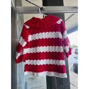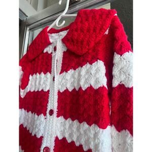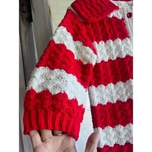 Vintage red and white striped crochet handmade cardigan sweater with large collar and button front. There are no major stains, holes, or tears. There is no tag, but it fits a size small. Please check measurements before purchasing!