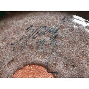 This gorgeous piece of studio pottery is 19 1/2″ wide x 5″ tall with the base measuring 10". There is a 1/2" lip around the piece. At the base there is a 1" stand. There is a double wire hanger attached through two holes on the stand portion for hanging on the wall. There are six green pieces of felt on the base as well.