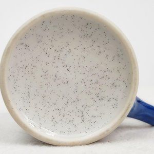This Hearst Castle souvenir mug has a blue painted graphic of the famouse Hearst Castle on front, also lined w blue trim. Stoneware pottery is grayish w dot pebbled textured appearance. Vintage 1970s (we think). Fun kitsch travel souvenir ceramic.
