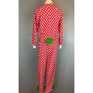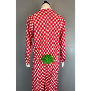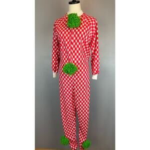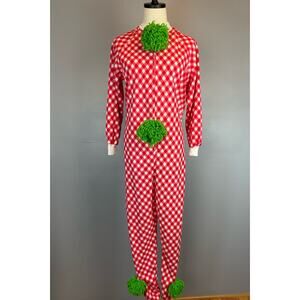 Vintage 1970s hand made one piece red and white checked clown costume with green pom poms.