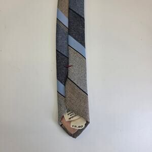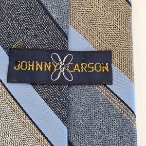 Vintage Johnny Carson Menswear tie from the 1970s featuring classic tan, blue, and gray diagonal stripes. Made in the USA of imported polyester fabric and still shows the original $12.50 price tag inside. A great retro accessory for collectors or vintage-style looks.