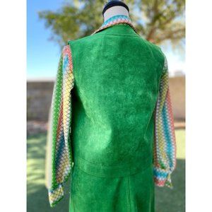 Gorgeous ultrasuede (washable, synthetic “vegan” suede) Kelly green skirt and vest set, vintage from the 1970s.