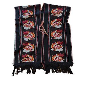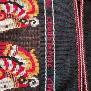 Embrace the vibrant Bohemian spirit with this stunning Vintage 1970s Knit Cuauhtemoc Cardigan Poncho Cape Sweater. This colorful piece features a geometric pattern with Aztec accents and fringes, perfect for a festival or a casual day out. The collarless design and V-neckline adds a touch of classic elegance to the overall boho look.