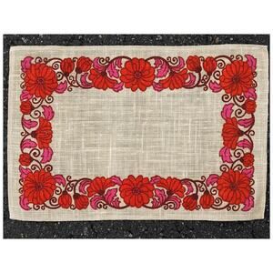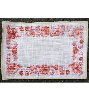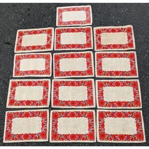 Set of 13 vintage 1970's linen placemats with a beautiful printed floral border in pink red & brown on a natural background. Most of the placemats are in excellent condition but there are a few with small spots (see pointing fingers in last pic) & there is some color variation of the background likely caused by laundering (see pic with 2 placemats).