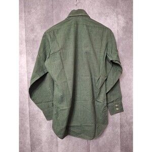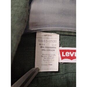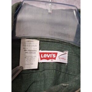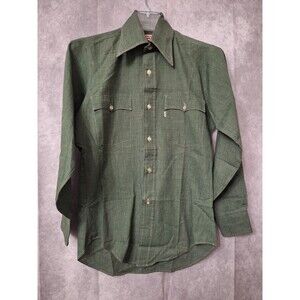 This Vintage 1970's Levi's White Tab Button Up Western Shirt is a classic workwear outdoorspiece of men's clothing made in the USA. The shirt features a green color, long sleeves, a button-front style, and is crafted from a comfortable cotton blend material. With a rockabilly look and a chest size of 40 inches, this original Levi's shirt in size small is perfect for wear to work occasions. The shirt's shoulder to shoulder measurement is 15 inches, and the length from shoulder to hem is 22 inches, making it a versatile and enduring addition to any wardrobe. Chest 40 in. Length 28 in. Sleeves 22 in.