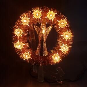Orignal box. Very nice tree topper with orange lights, gold tinsel, and gold angel. Beautiful orange-gold glow.