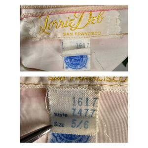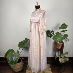 Beautiful and romantic 1970s victorian, prairie dress by Lorrie Deb. This has a sheer floral jacquard overlay with pink, ivory velvet stripes and woven flowers that have a raised velvet texture. Trimmed in delicate lace with pink velvet ribbon accents. High Victorian collar & puffed bishop sleeves finished with ribbon bow details.