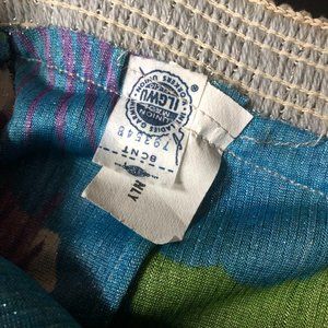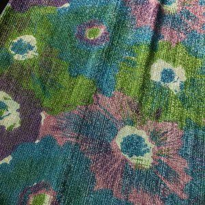 Vintage 1970s or possibly late 60s lurex maxi skirt with a big, bold floral pattern. This skirt zips up the back and has an elastic waist. In excellent condition except for some discoloration at the waistband.