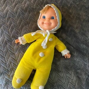VINTAGE 1970’s 12” Mattel Baby Beans doll. Very good condition. No tears at the seams. There is discoloring on the fabric due to age but no visible spots or stains. Body is a fabric filled bean bag and the head is plastic.