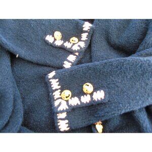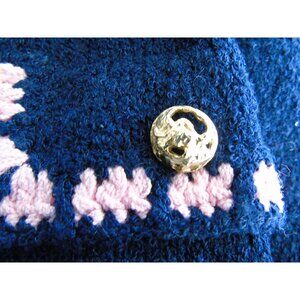 The jacket is exquisite with 13 gold tone buttons. Navy knit with pink "crochet" around the neck, lapels, base of the jacket, lower sleeves. and pockets.