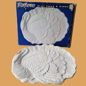 Beautiful white ceramic embossed realistic turkey platter from Mayflower, made in japan. This handsome 18"x 13.75" platter is in its original box and is in perfect condition, likely only used a few times for holidays.