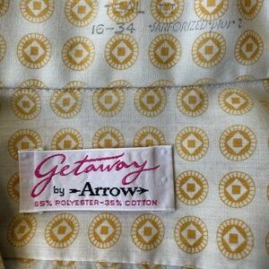Check out this vintage Arrow (Getaway) long sleeve button down striped men’s shirt. In a great yellow/gold all over pattern print on white shirt. Made in late 1970s, based on the tag. Two buttons at wrist. Rounded hemline, slightly longer in back. In excellent condition; no noted flaws. Presumably made of polyester and cotton based on other shirts I have. Machine washable. Care instructions printed on front left exterior bottom of shirt (presumable expected to be tucked in). Check measurements in photos to determine fit; Size is listed as 16-34 which is usually indicative of a size large.