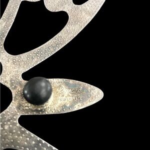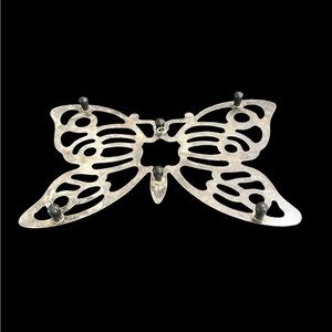 Made in Italy vintage silverplating metal butterfly countertop trivet. Hanging hook so it can transition from wall decor to a hot pot trivet protecting delicate surfaces, as a plant stand or paperweight! We just love it when a single item has multiple uses! Made in Italy for Leonard Brass.