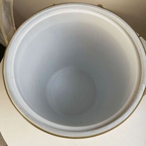 Vintage metallic gold insulated ice bucket with clear top, lucite handle and knob. Comes with gold metal tongs, a bottle opener cutter, or a cheese knife. This would look great on a poolside or on a mar cart. Definitely a mid-century modern vibe. Maker unknown. Excellent Shape ~ Retro. Nice tall size. Tongs Included, handle, lightweight, insulated, cover included