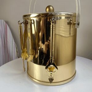Vintage 1970s Metallic Gold Ice Bucket Clear Lucite Handle with Bar Utensils Barware