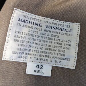 Great condition, stylish coat. No stains or holes. Epaulettes buttons on the shoulders. Side pockets and hidden interior zippered pocket. Nylon lined. All buttons intact including extra buttons on inside.. Storm Flaps to deter water. No belt. The zippered liner has been removed. Men’s size 42. Estimated to be a women’s XL. Measurements: