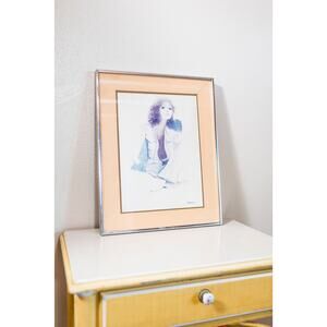 Vintage 1970s Mod art print by renowned artist Christine Rosamond, matted in a pastel-peach mat with a 16x20" silver-toned modern frame. The artist beautifully signed this striking pastel lithograph, ready to display.