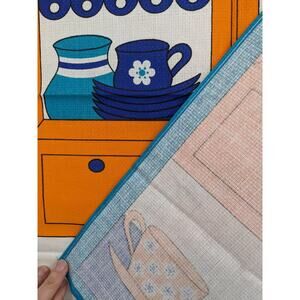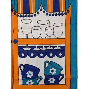 Bright kitchen dish tea towel by Brazilian Company KARSTEN. Mod pop art design of a very vintage 1970's British-type teapot with cups & saucers. In the background is a curtained butler's pantry with dishes & glasses all in neon bright colors of tangerine teal cobalt & white. Fabric is 100% cotton in a waffle-weave construction. About 18 by 26 inches. Perfect unused new-without-tags condition; some storage wrinkles.