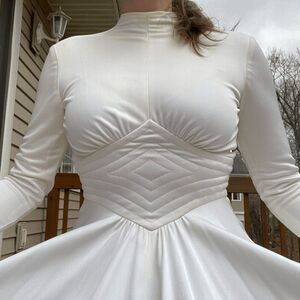 This incredibly rare, true vintage, late 60s or early 70s mod wedding dress perfectly embodies the era's signature style with its minimalist and sleek design. The high neckline, long sleeves, and gracefully flowing full skirt emphasize modesty while retaining an elegant and timeless appeal. The quilted detailing on the bodice and cuffs is a distinctive feature that nods to the 1970s, adding a touch of textural interest and structured sophistication.