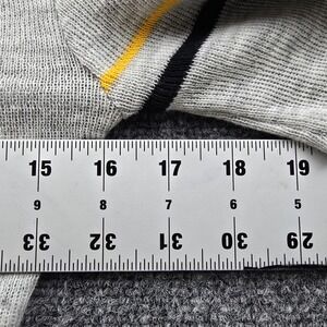 Vintage Montgomery Ward polo shirt from the 1970s. All-polyester knit with a waffle/stretch weave, light grey base with yellow & black stripes. Tagged "L" but the actual flat measurements are pit-to-pit ~16″ and length ~26″, more like a Men's XS.