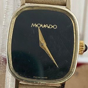 Vintage 1970's Movado Ladies Watch from an estate sale New 8 inch Movado Tan Leather Strap with Movado Buckle 17 Jewel Mechanical Zenith Swiss Factory Movement Machined case is 1.125x 0.75 with lugs inch 10 Micron Gold Platted with Movado Black Onyx crown Swiss made Nice clean Mineral Crystal Gold Sword Hands no Battery need hand wind marked 20.0550.305 Stainless Steel Back case inside marked Zenith