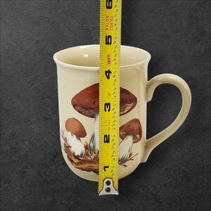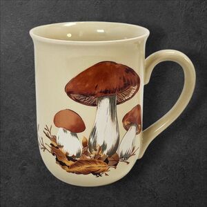 Step back into the groovy 70s with this vintage mushroom mug; the perfect blend of earthy tones and retro charm. Each mug features a double-sided mushroom scene on a warm cream base, unmarked but unmistakably from that classic mid-century mushroom craze.