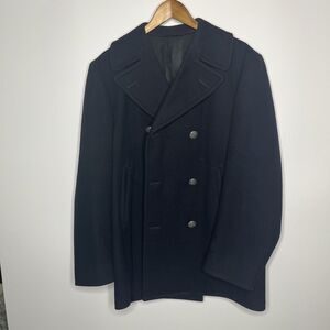 Vintage 1970s navy and black wool peacoat with pewter buttons, size 38R. Classic enlisted men’s style, warm and durable. Timeless military-inspired design, perfect for layering and winter wear.